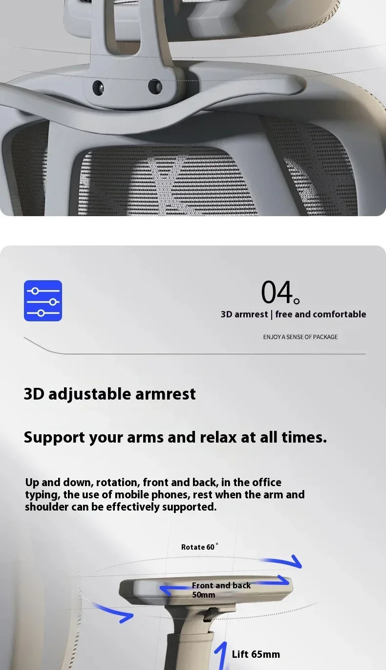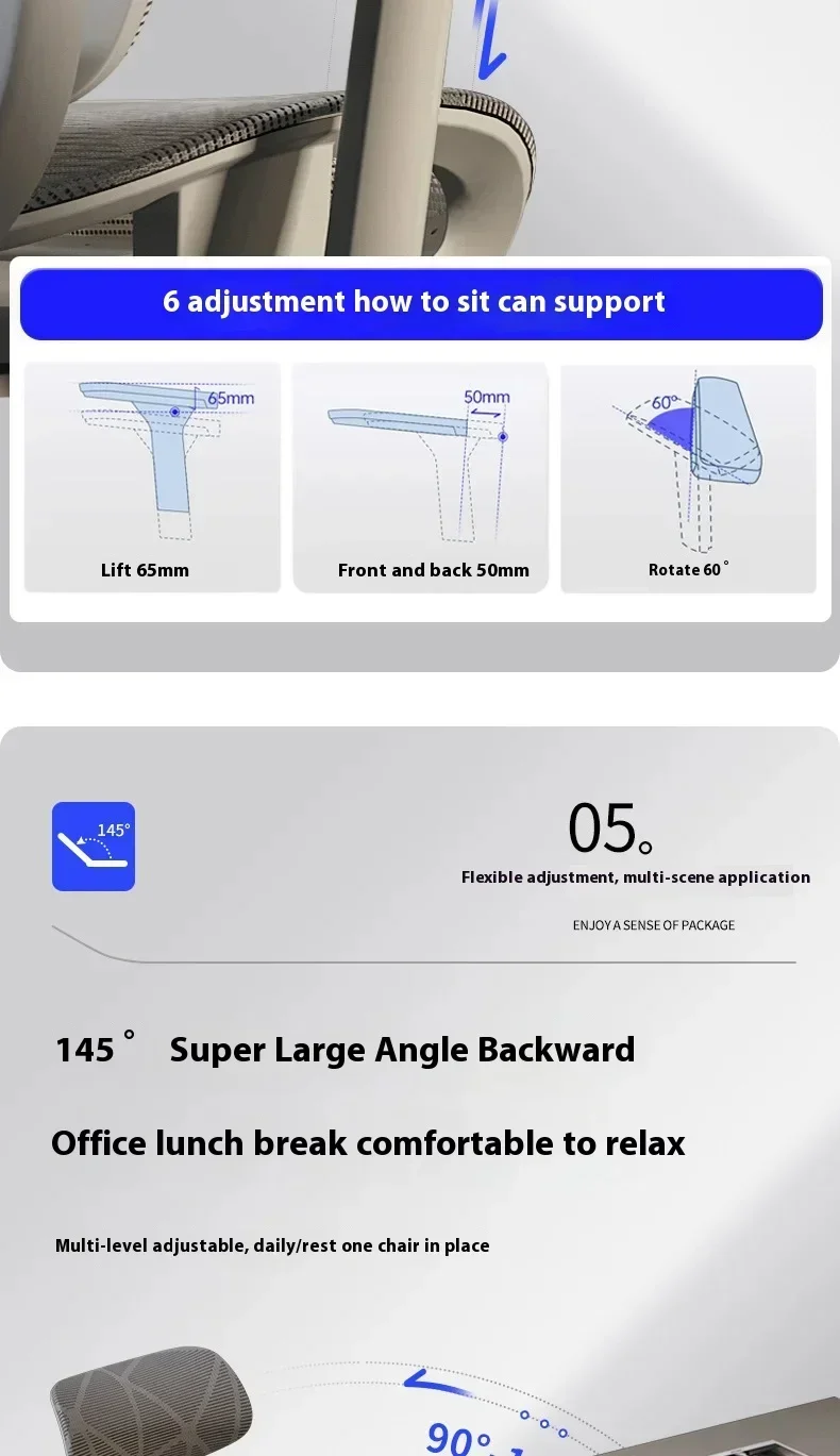 • 2. Elastic adaptive lumbar support, 3D adjustable neck pillow, 3D armrests, 2 zones of separation of the lumbar back, 5cm sitting depth adjustable, 145 ° comfortable back lying