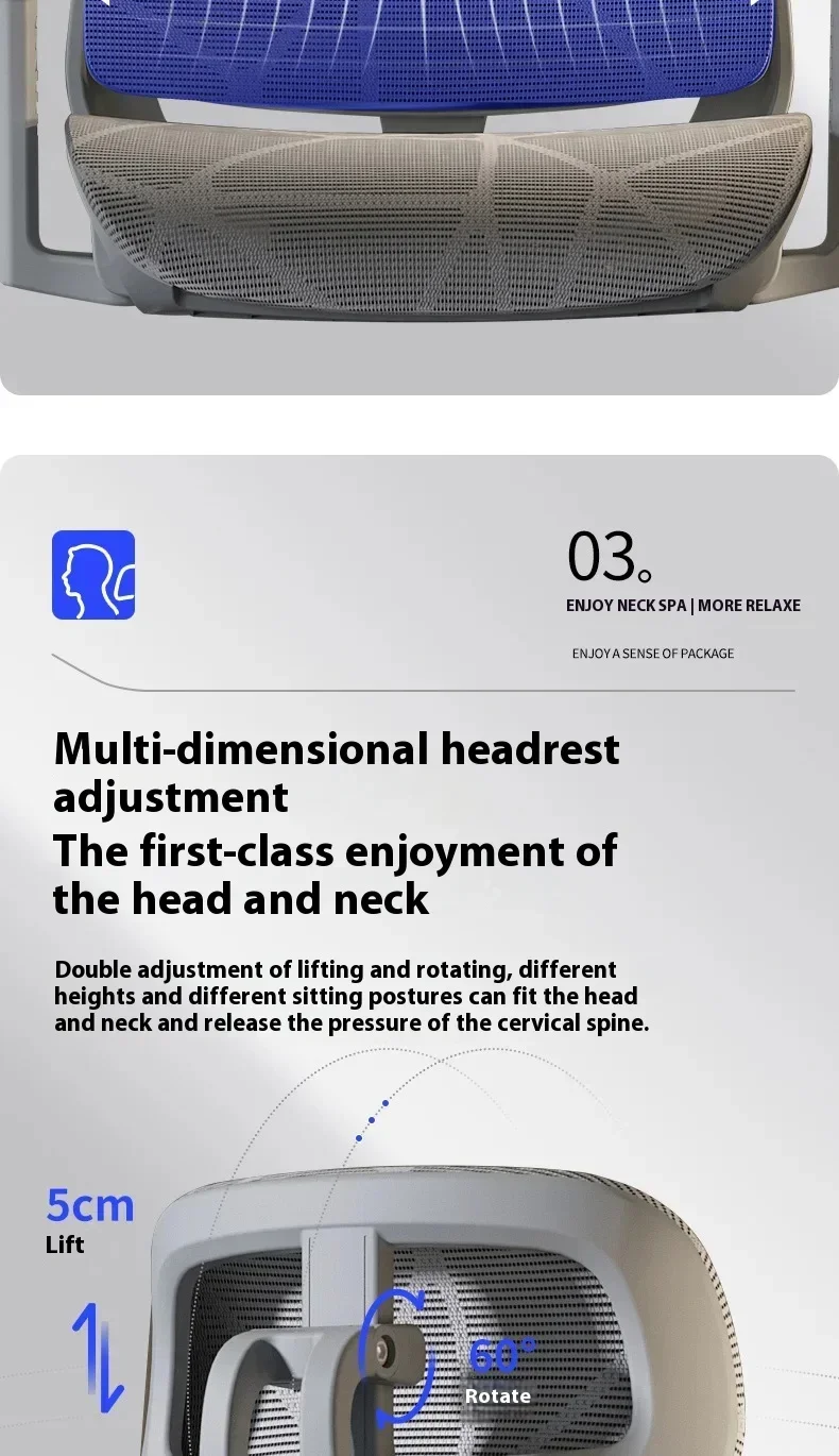 • 4.Headrest: 8CM lift adjustment, 60°rotation adjustment, to adapt to different height needs, to adapt to different tilt angle needs.