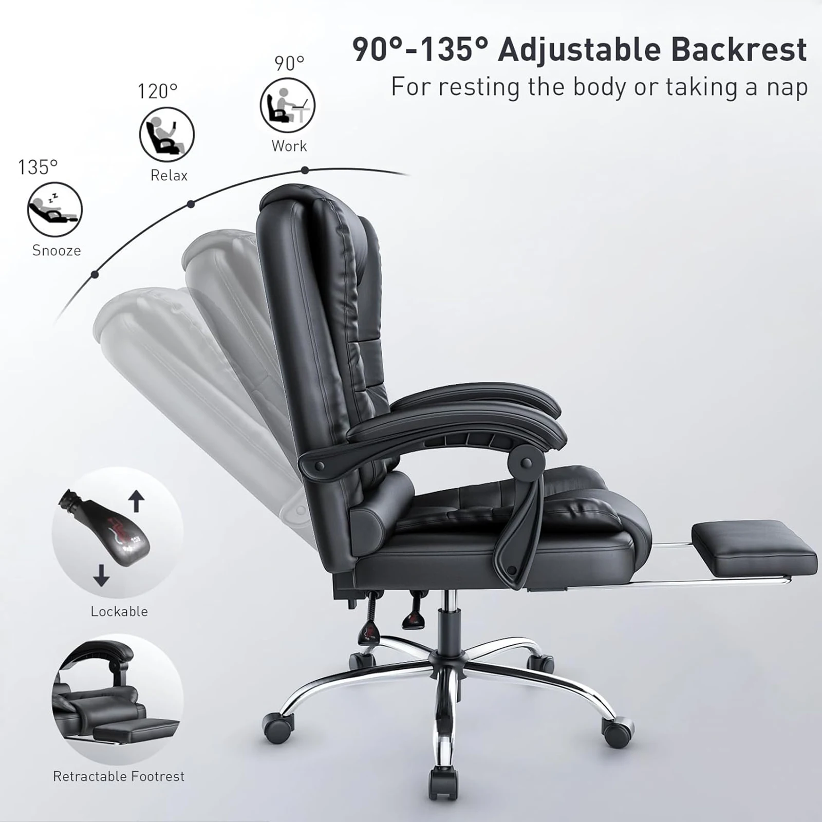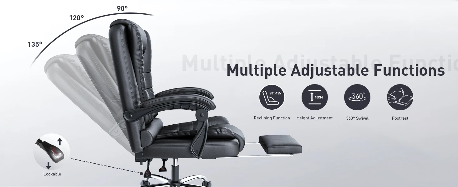--The backrest tilt position can be locked between 90°-130° to suit your needs for work, relaxation and naps. The seat can be adjusted up or down by 10cm to set the optimum height for you, and the 360° swivel function allows you to multitask with ease.