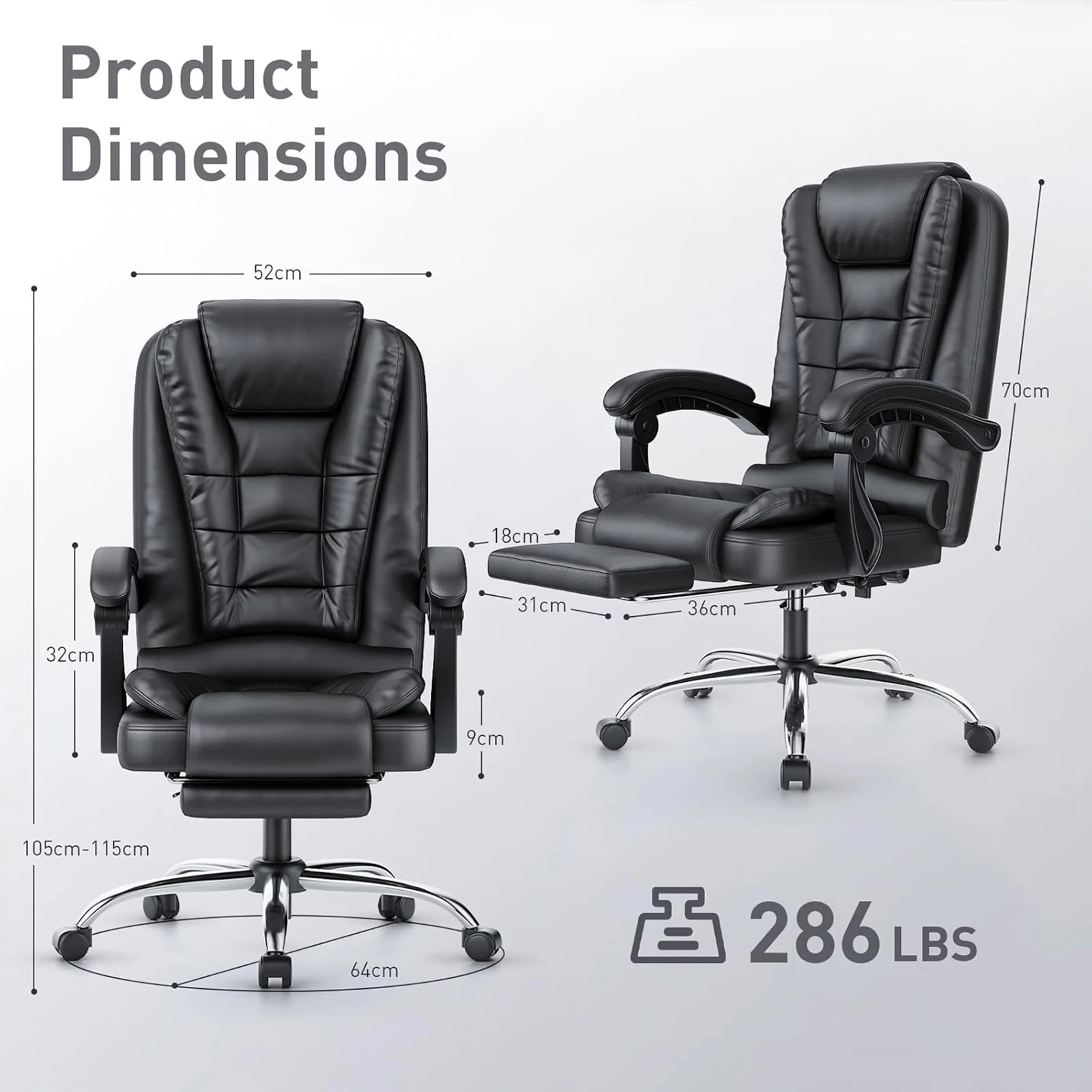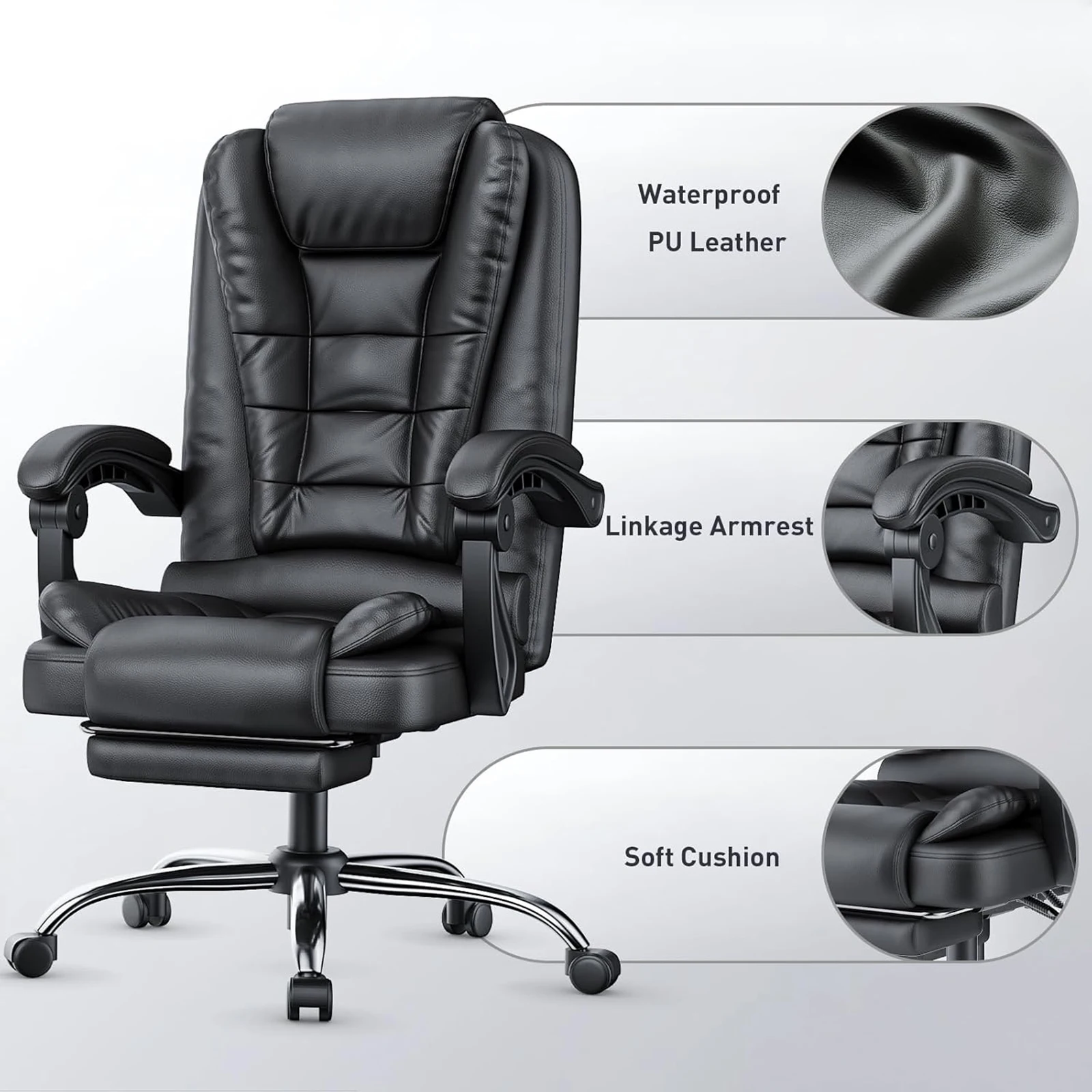 --The surface of the swivel executive chair is made of PU leather, premium texture, skin-friendly and wear-resistant. The smooth surface can be easily cleaned with a damp cloth. Heavy duty metal bracket and chair legs enhance the durability of the chair.